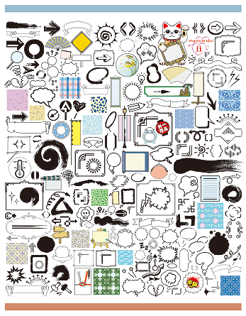 ◎ 収録カテゴリーと点数:タイトルBOXフレーム84点・タイトルBOXリボン87点・コラムイメージ(カラー,モノクロ)各67点・コラムテンプレート(カラー,モノクロ)各102点・コラム一般(カラー,モノクロ)各36点・パターンタイル(カラー,モノクロ)各200点・バクダン87点・吹き出し148点・カッコ170点・矢印216点・感情マーク159点・筆パーツ(曲線,波線,丸形,三角,四角,バクダン,吹き出し,矢印,渦巻,他)305点